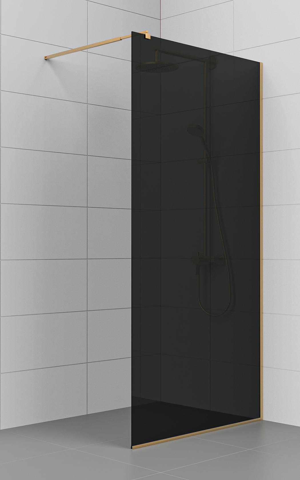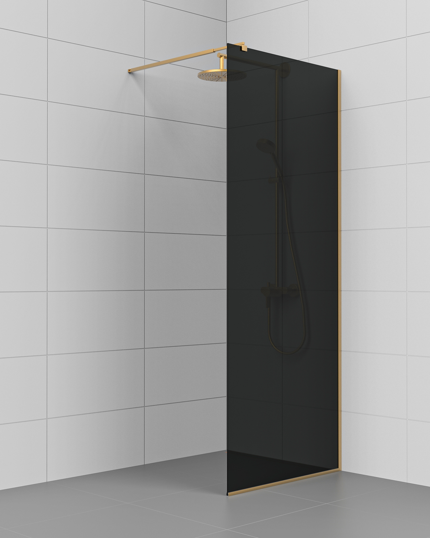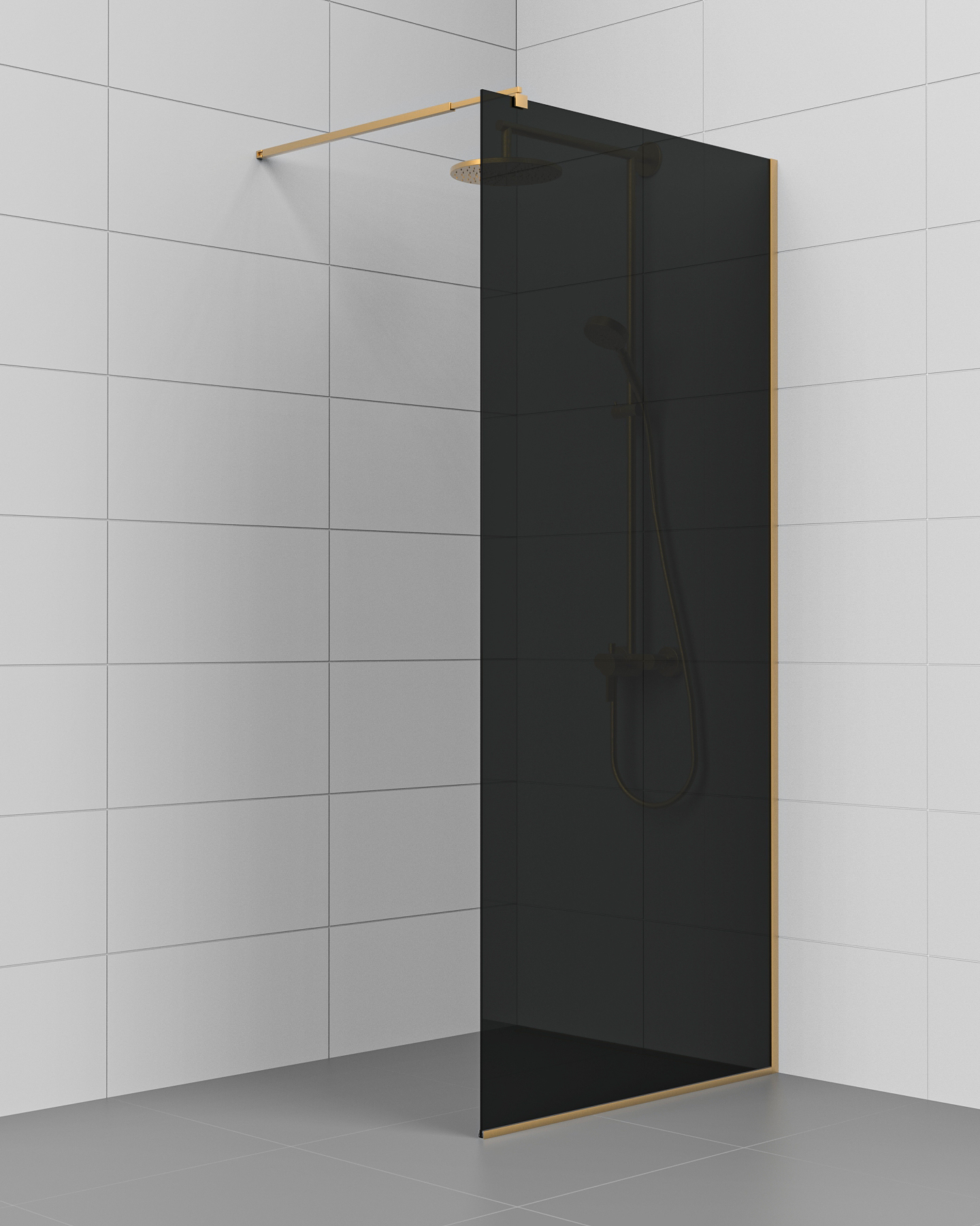 Kiinteä suihkuseinä KL25-KL27 – lattia- ja seinäprofiili sekä sivutuki harjattua messinkiä